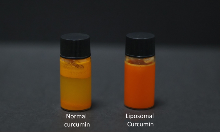 La curcumine liposomale forme un système homogène et stable dans l'eau.