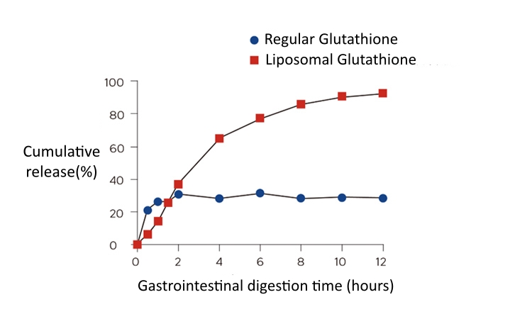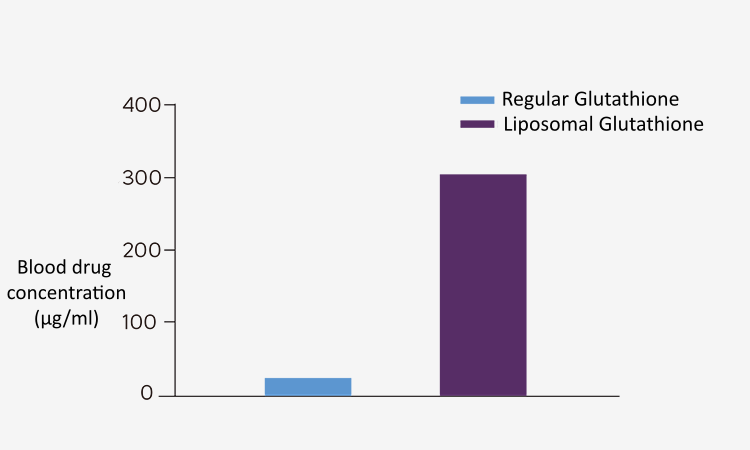 La biodisponibilité du glutathion liposomal est jusqu'à 13 fois supérieure à celle du médicament original. Le glutathion liposomal atteint une concentration plasmatique maximale (Cmax) plus élevée et son effet est significativement plus long que celui du médicament original.