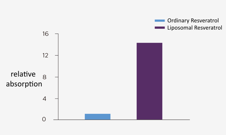 Comparativement au resvératrol seul, l'absorption relative du resvératrol via les liposomes a été augmentée d'environ 14 fois.